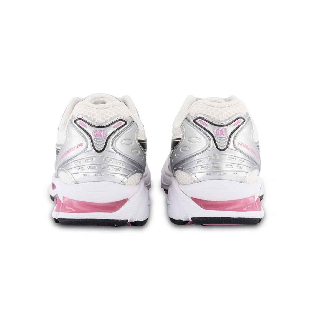 L'ASICS Gel Kayano 14 « Cream Sweet Pink » arbore une tige en mesh blanc cassé à cellules ouvertes avec des empiècements en cuir synthétique brillant argenté métallisé. De larges lignes noires dessinent les contours arqués des bandes latérales emblématiques, tandis que des touches roses contrastantes soulignent les éléments de la marque qui ornent la languette et le talon. Cette chaussure rétro est dotée d'une semelle intermédiaire en mousse blanche avec un amorti Gel visible teinté d'un rose vif. Sous le pied, la semelle extérieure en caoutchouc présente des rainures de flexion et un cambrion en TPU apparent.